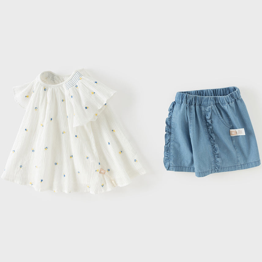 Dave&Bella Summer Toddler Girls Cute Beige Flutter Sleeve Top Jean Shorts Outfit Sets